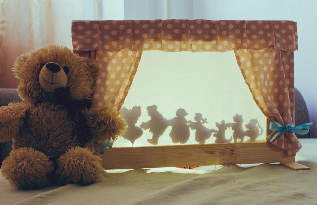 Na klasické stínové divadlo toho potřebujete opravdu málo. Jen své ruce, světlo a pozadí. Stačí i bílá zeď bez dekorativních prvků, ale můžete si připravit také natažené prostěradlo na šňůru či mezi dvě židle. Ještě lze vytvořit krabici jako malou scénu.